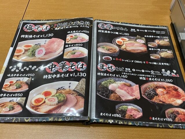 塩そば850円、中華そば850円、濃厚つけ麺900円、まぜそば880円、他。麺類すべて大盛り無料。