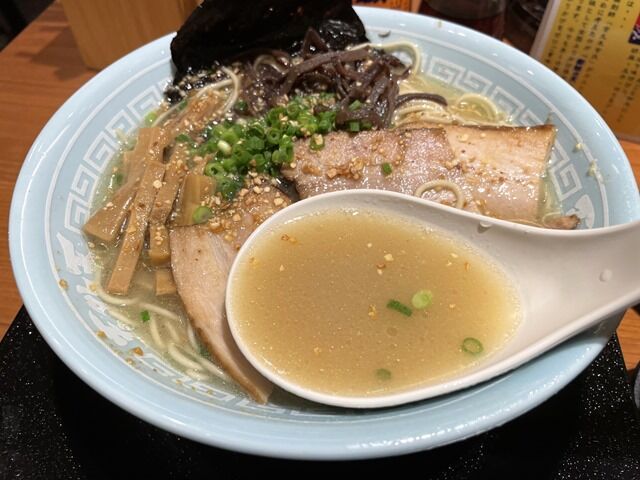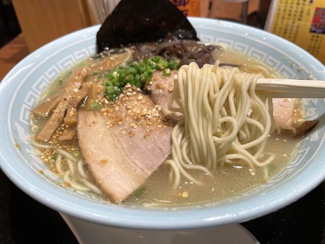 スープは白濁したさらさらの豚骨醤油味。豚骨のげんこつに鶏ガラ。タレは熊本産薄口醤油に魚醤。提供温度がわずかに低めかな!?まあ影響はあまりありません。重すぎずクドすぎず、あっさりとした中に豚骨のコクと旨みがしっかり。なんと言ってもガーリックパウダーが絶大な効果を発揮してパワフルさとワイルドさとインパクトとパンチをアドオン。これぞ熊本ラーメンの真骨頂といった味わいですごく美味しい!