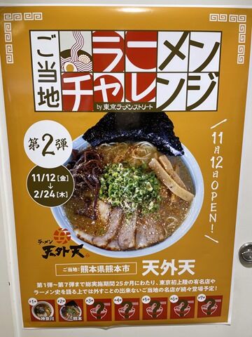 全国各地のご当地ラーメン有名店が期間限定で出店する企画「ご当地ラーメンチャレンジ by 東京ラーメンストリート」。第1弾~第7弾まで総実施期間25か月に渡る長期イベント。第一弾は支那そばや(2021/7/15〜11/4)。第2弾は熊本ラーメンの人気店「ラーメン 天外天」(2021/11/12~2022/2/24)が登場。