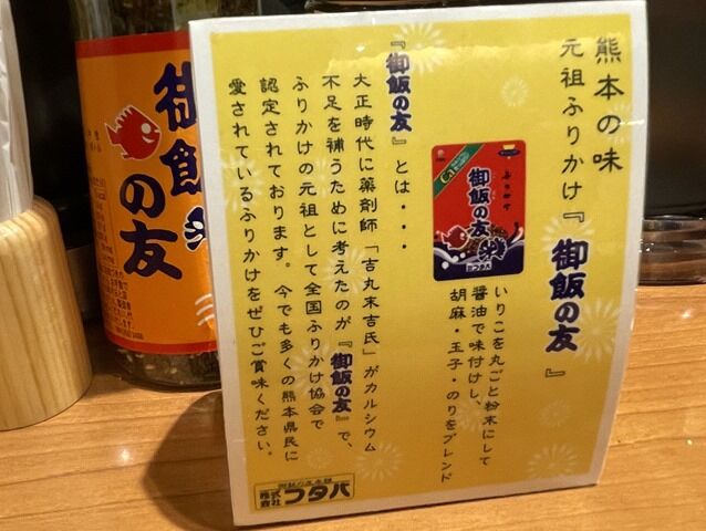 BGMは無し。箸は割り箸。卓上調味料はペッパーミル入り胡椒、ふりかけ御飯の友、替玉のタレ。