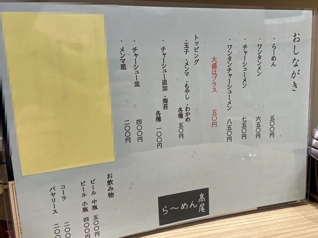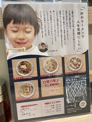 券売機は無く後会計制。主なメニューはらーめん500円、ワンタンメン650円、チャーシューメン750円、ワンタンチャーシューメン850円(11月中100円引き)、味噌ラーメン600円(日曜限定・辛さ調節可能)、トッピング玉子・メンマ・もやし・ワカメ 各50円、他。玉子はデフォ固ゆでで、リクエストすれば半熟も可能。