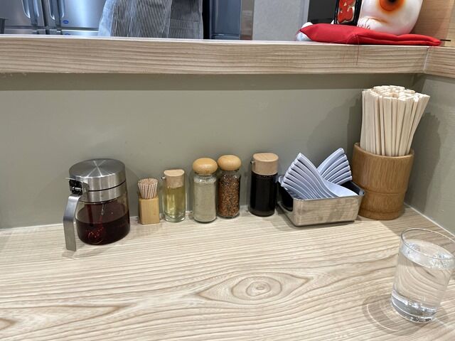 BGMはJ-POP、桜坂の女性ボーカルによるカバー、For youとか♪箸は割り箸。卓上調味料はラー油、酢、白胡椒、七味唐辛子、醤油。