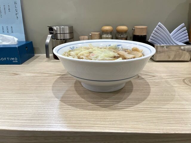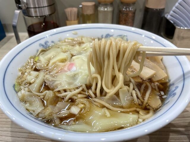 具はワンタン、メンマ、なると、きざみねぎ。ワンタンは具のないツルッとした食感を楽しむ皮ワンタン。驚くほどたっぷり入り。麺と同様にひらざるによる湯切り。