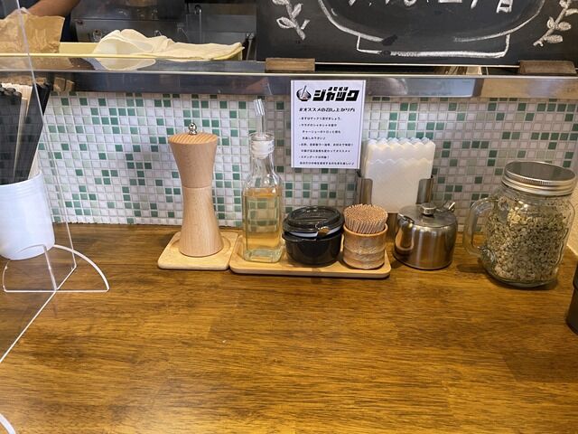 卓上調味料はペッパーミル入り胡椒、酢、おろしにんにく、自家製ラー油、揚げ玉。