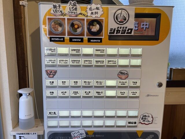 入店するとまず券売機で食券購入です。主なメニューは、まぜそばジャック870円、台湾まぜそば900円、カルボまぜそば900円、チャーシュー丼380円、TKG230円、他。