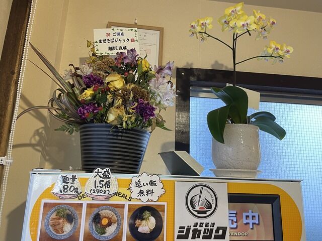 券売機上には麺匠克味からの祝花。当初麺庄から花台が来ていたようです。