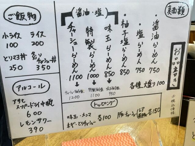 券売機は無く後会計制。主なメニューは醤油らーめん750円、塩らーめん750円、柚子塩らーめん850円、ランチ限定鶏マヨ丼250円→150円、他。
