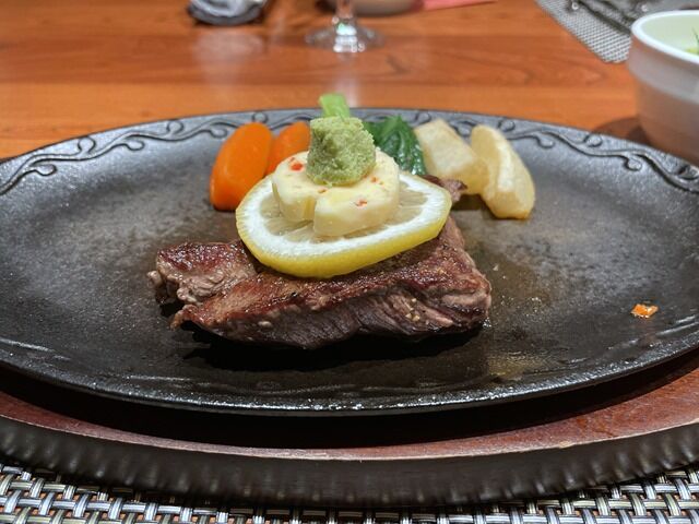 ステーキの上にスライスレモン、バター、わさび。つけ合わせはニンジンほうれん草、ポテト。