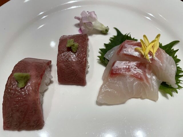 「特上前沢牛にぎりと真鯛のコブじめ取り合わせ」