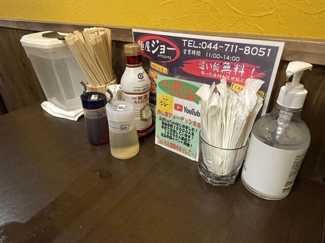 BGMは最新J-POPとTVのW放送。TBS「王様のブランチ」、「買い物の達人」なうオンエア。箸は割り箸。卓上調味料は醤油、酢、ラー油。