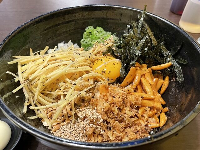 具は飲食店でめし家ジョーが初めて使用したという島原の百年生姜の針生姜、柿の種、卵黄、フライドオニオン、きざみ青白ねぎ、きざみ海苔、胡麻、他。