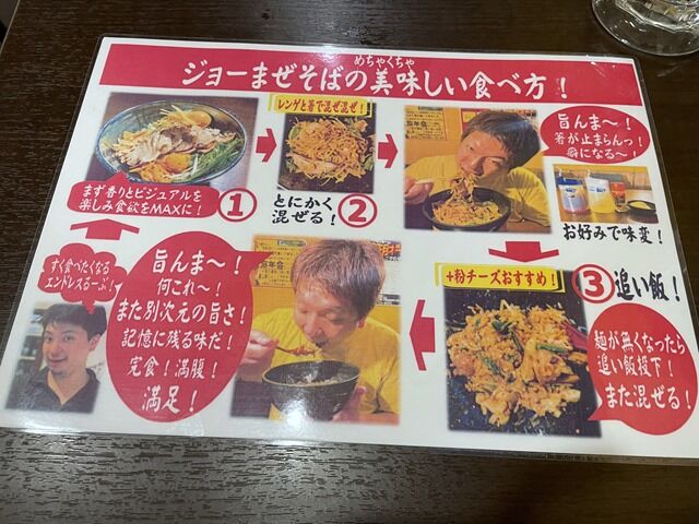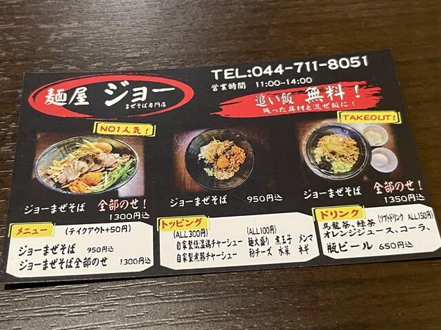 券売機はなく後会計制。主なメニューは、ジョーまぜそば950円、ジョーまぜそば全部のせ1300円、他にトッピングとドリンク。追い飯無料。ご飯まではという方には、麺少なめ・または麺半分可能。テイクアウト対応。