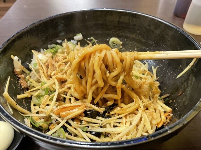 麺はストレート極太タイプ。丼の底に醤油ベースでコクと旨みの強いタレが沈んでいます。グリングリンと良くかき混ぜていただくと、むっちりもっちりコシのある麺にこくまろのタレが絡んでこりゃ美味しい!さらに百年生姜や柿の種といった異色で独特なトッピングが複雑で多彩な食感と味わいを演出。オリジナリティの塊でオンリーワンなまぜそば、未知でスリリングな味わいですがすごく美味しい!