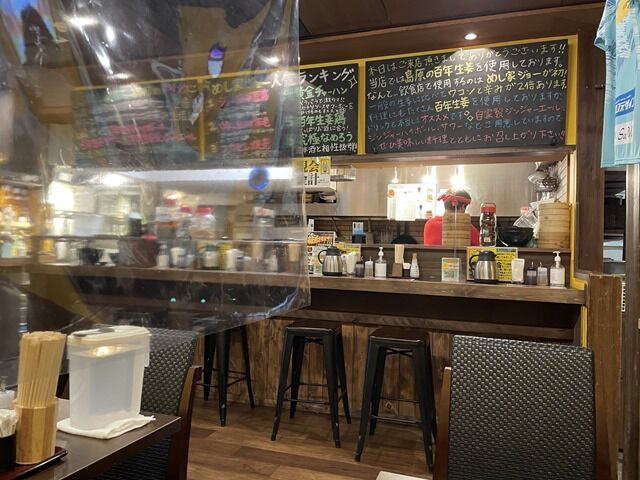 店内は厨房前に真っ直ぐなカウンター5席、2人卓x4。テーブル間は天珠から吊り下げのビニールシートにより仕切りあり。消毒液は各席に配置。