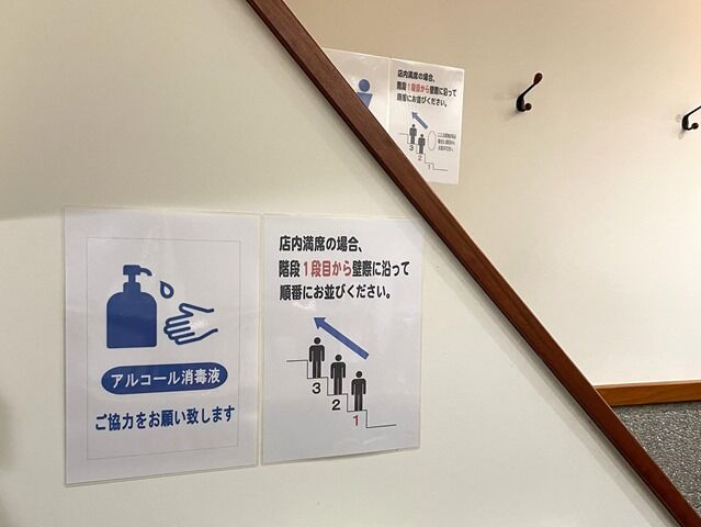 満席時は外待ちではなく、店内の階段に下から上へ列を作る方式。スタッフは店主さんとサポートの男性で、計2名体制。