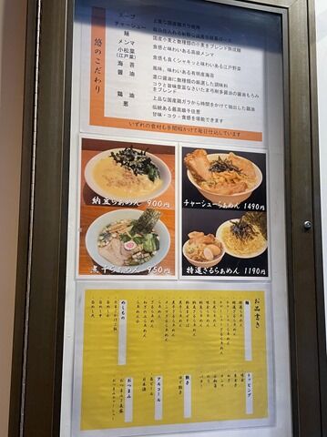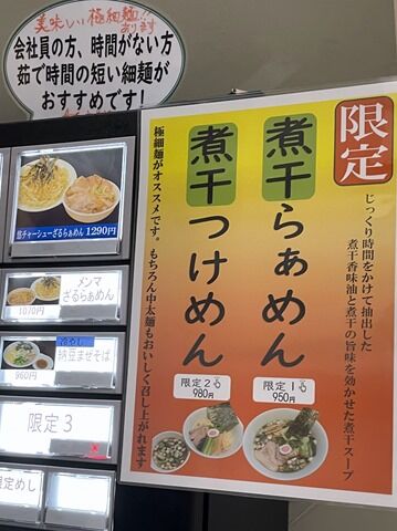主なメニューは、らぁめん860円、ざるらぁめん890円、冷やし納豆まぜそば960円、煮干らぁめん(限定1)950円、煮干つけめん(限定2))980円、他。