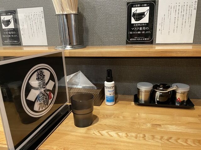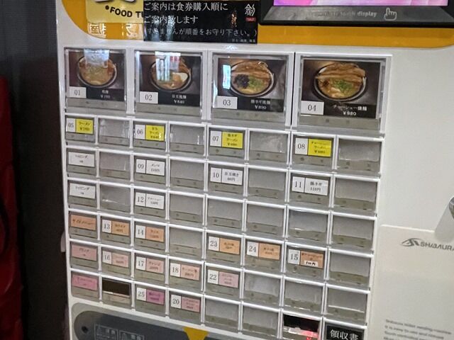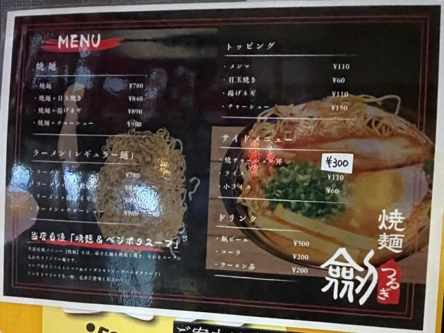 入店するとまず券売機で食券購入です。主なメニューは、焼麺780円、目玉焼麺840円、ラーメン780円、焼チャーシュー丼300円、他。