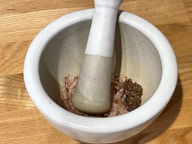 最初に味変用の鰹節が提供されます。実際には鰹節+魚粉。鰹節をすりつぶしてお待ち下さいとのこと。個人的には鰹節は潰さずそのままで、お好み焼きや焼きうどん用的に使うのが好み。
