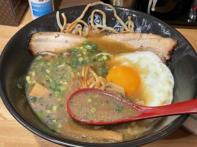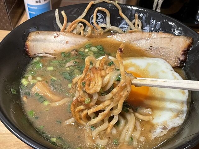 具は、チャーシュー、目玉焼き、メンマ、万能ねぎ。焼いた麺が剣の形になってる!