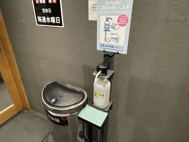入口入ると風除室があって、そこに券売機と消毒液があります。壁面にはメニュー当各種ポスター掲示。