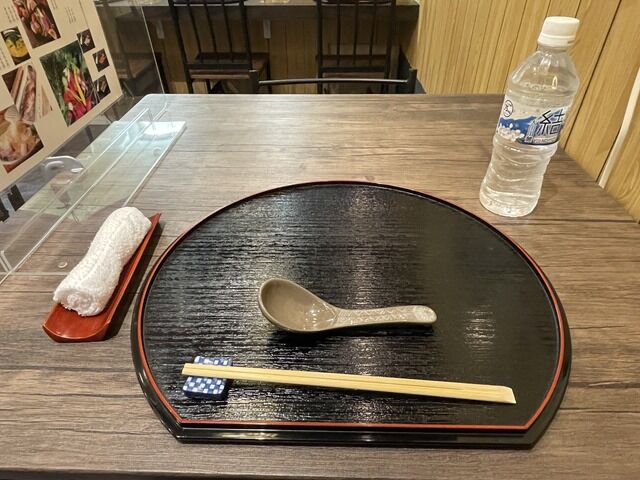 BGMはジャズ。箸は割り箸。卓上調味料は無し。お冷はミネラルウオーターをペットボトルで提供。