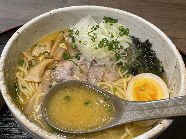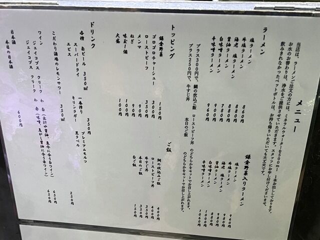 券売機は無く後会計制。主なメニューは塩ラーメン860円、牛骨 塩ラーメン880円、醤油ラーメン780円、海老塩ラーメン880円、白味噌ラーメン900円、辛味噌ラーメン960円、他。