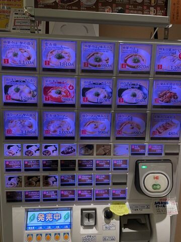 気を取り直してまず券売機で食券購入です。主なメニューは中華そば870円、鶏白湯ラーメン 940円、塩ラーメン 880円、上海ネギ混ぜそば880円、特製白醤油鶏そば1100円、つけ麺940円、塩つけ麺940円、他。