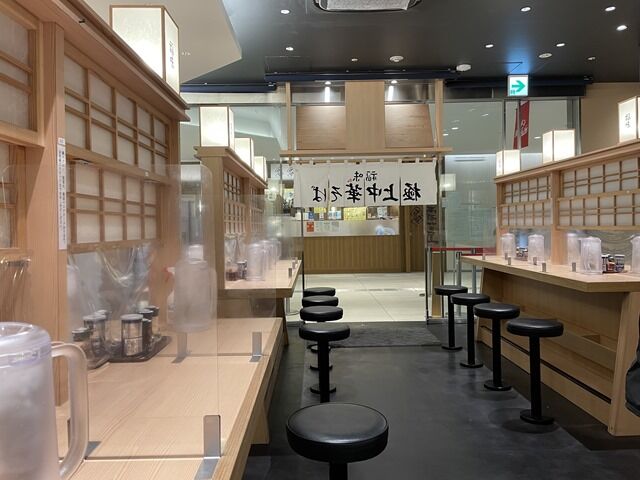 店内は長テーブルの中央に高い仕切りを設けた対面カウンター27席、2人卓x2。カウンター1席ごとにアクリル板の仕切りあり。消毒液はカウンター奥の端に配置。
