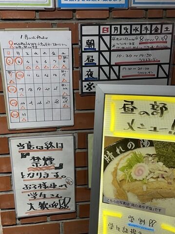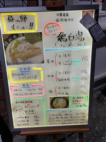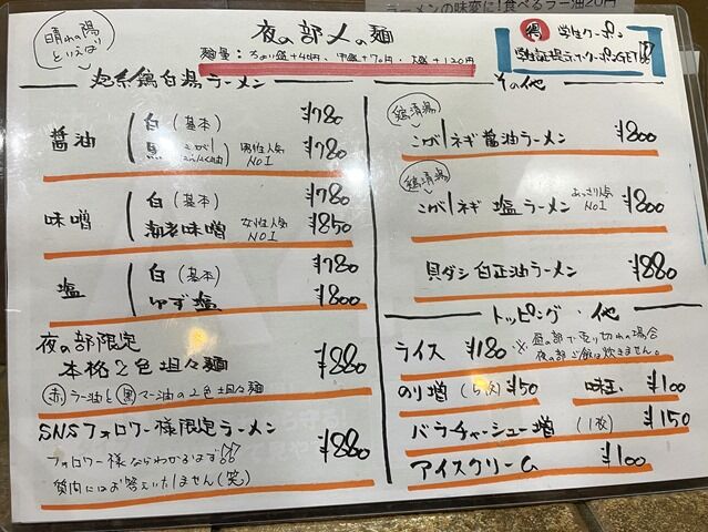券売機は無く後会計制。主なメニューは、(泡系鶏白湯)醤油白・黒780円、味噌白780円、海老味噌850円、塩白780円、ゆず塩800円、(夜の部限定)本格2色坦々麺880円、フォロワー限定ラーメン880円、