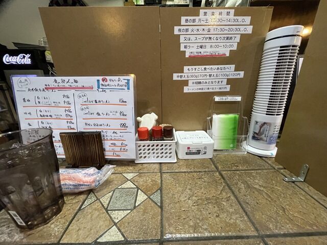 BGMはテレビ放送、日テレ「有吉の壁」なうオンエア。箸は割り箸。卓上調味料はハウス七味唐がらし・大辛唐辛子・コショー、すり胡麻。