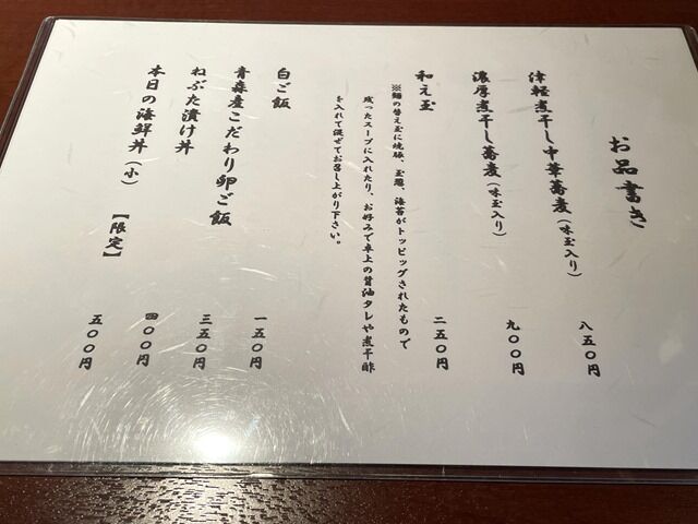 券売機はなく後会計制。メニューは、津軽煮干し中華蕎麦850円、濃厚煮干蕎麦900円、和え玉250円、白ご飯150円、青森産こだわり卵ご飯350円、ねぶた漬丼400円、本日の海鮮丼(小)【限定】500円。