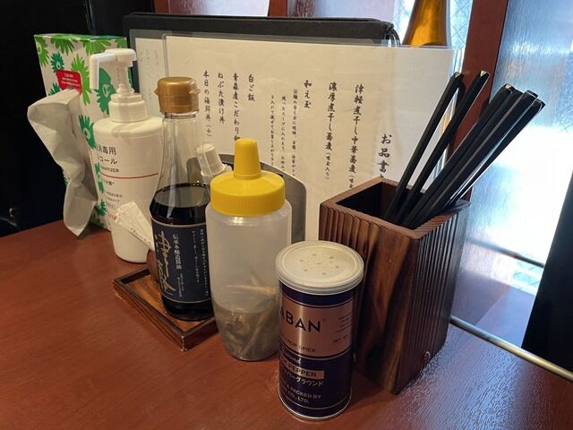 BGMはポップス。箸は洗い箸でエコ仕様。卓上調味料は中村醸造元の伝承 本醸造醤油津軽、煮干酢、GABANブラックペッパー。