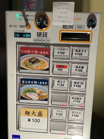 入店前にまず店外店頭券売機で食券購入です。主なメニューは口水担々麺880円、醤油雲呑麺880円、他。