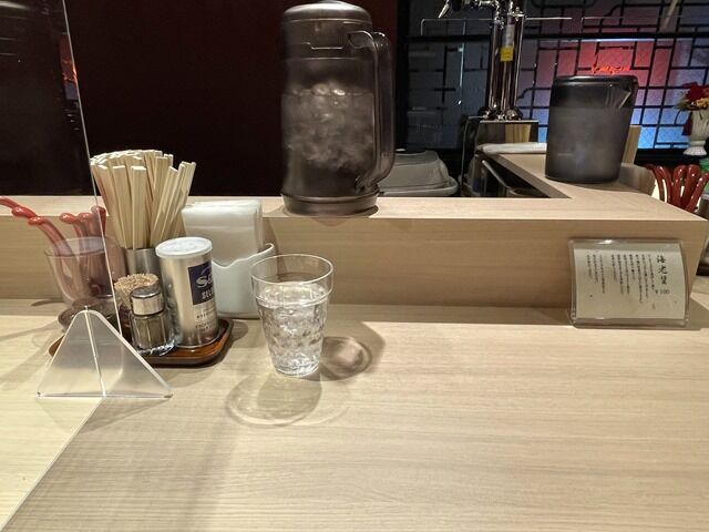 席はL字型カウンター8席、奥に2人卓x1。カウンター1席ごとにアクリル板の仕切りあり。消毒液は外の券売機上に配置。18:30頃到着で先客1後客1。スタッフは厨房に店主さんとサポートの男性2名体制。