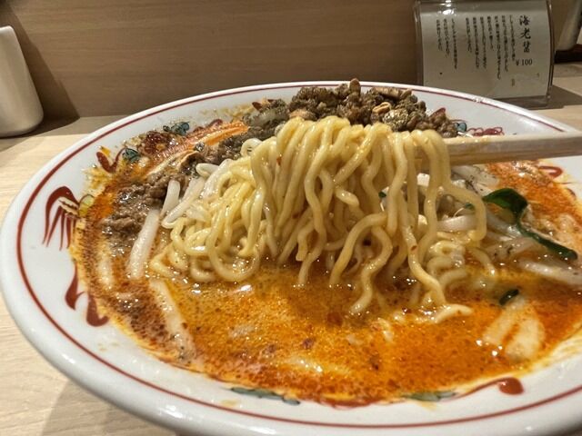 スープは軽くとろみを感じる担々胡麻味。多彩な醤を独自にブレンドして香り高く濃厚な仕立て。「辛口」は辛さ程々で痺れがやや強め。辣油の香りや爽やかな痺れも素晴らしいですが、ベースのスープが力強く芝麻醤や辣油、花椒に負けない存在感を誇示。そのためスープと胡麻、痺れ辛味がハイレベルでフュージョン。本場式四川料理や本格中華料理らしからぬど濃厚な担々麺ですごく美味しい!