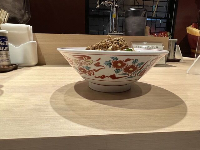 草花が華やかに側面を飾る麺鉢型の器で着丼。レンゲは外して撮影。
