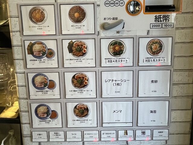 入店するとまず券売機で食券購入です。主なメニューは、全粒粉極濃つけ麺・デイ950円、たまり醤油ネオ中華そば・セイ、ローストビーフチャーシュー丼・肉ミンチヒーヒー丼 各400円、他。