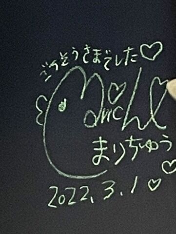 11:50頃到着で先客5、後客4。スタッフは男性2。まりちゅうさん(長澤茉里奈さん)が来店されて、サイン色紙と黒板的な壁面にサインがありました。