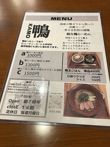 主なメニューはa 鴨らーめん1000円、b 鴨らーめん・鴨丼・漬物1300円、c 鴨らーめん・鴨丼・日替りサラダ・漬物1500円、他。