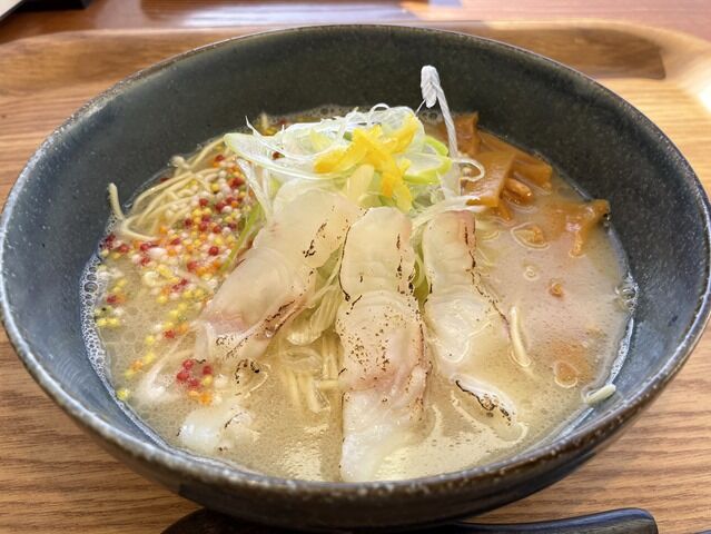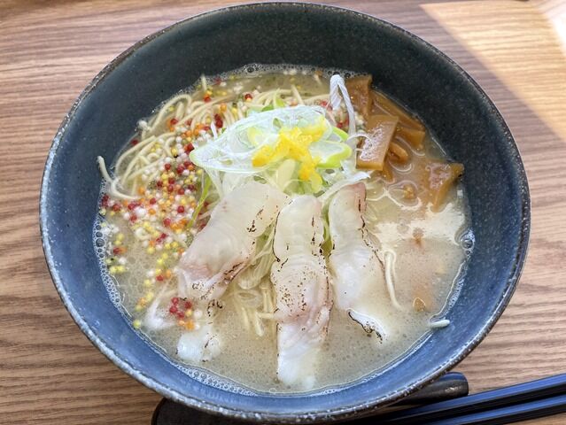 具は鯛?の切り身、メンマ、笹切りねぎ、色とりどりのカラフルなあられ、柚子皮。メニュー写真ではブリに見えますが、仕入れによりトッピングの魚が変わるのかもしれません。