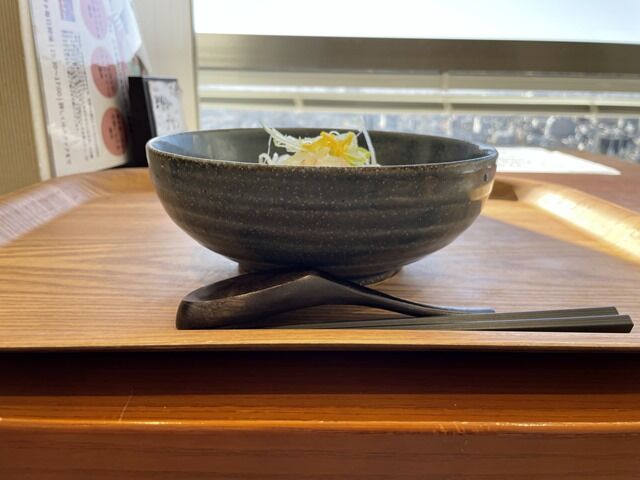 黒い玉丼が箸とレンゲと共にトレーに載って着丼。