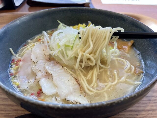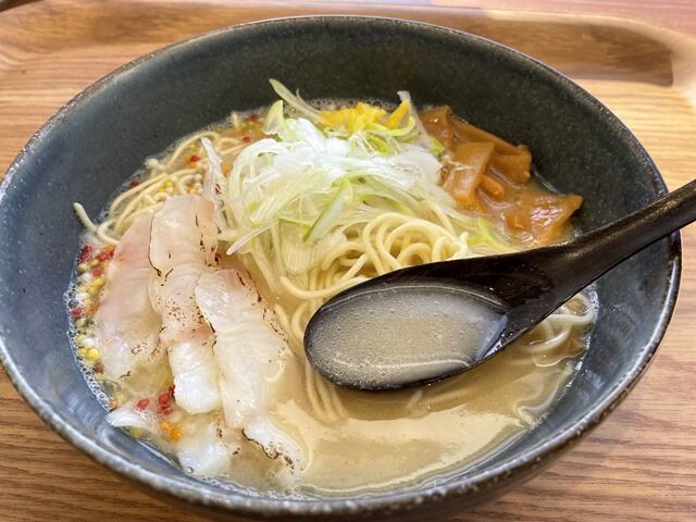 スープはさらりとした白湯塩味。麺屋音の白湯スープと一歩一歩の魚のあら出汁を合わせたスープ。鯛メインの魚の香りと旨みがガッツリ。区役所の食堂のレベルを超越した規格外の旨さ。実際魚が強くて苦手な人もいそう。魚リッチで切り身のトッピングも良く柚子の味変も効果的。さすが名店監修の一杯でとても美味しい!