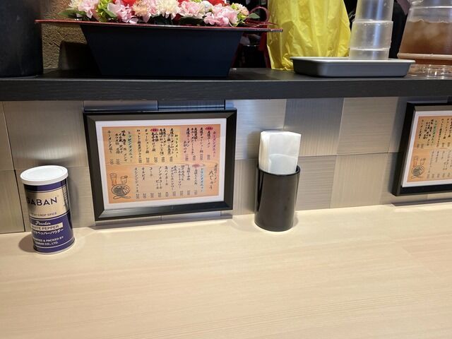 13:50頃到着で先客4後客6。スタッフは厨房・ホールに男女合わせて4。2名はスタッフTシャツ、2名はカープのユニフォーム!?