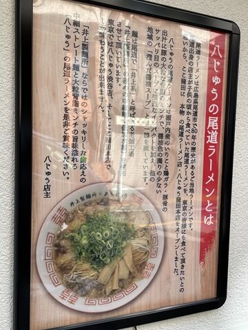 渋谷の「尾道ラーメン 八じゅう」の2号店。こちらは22年前に中目黒にお好み焼き・もんじゃ焼きのお店として創業。現在渋谷区宇田川町で、昼は「尾道ラーメン」、夜はお好み焼きのお店「八じゅう」として営業(蔓防中はラーメンのみ)。