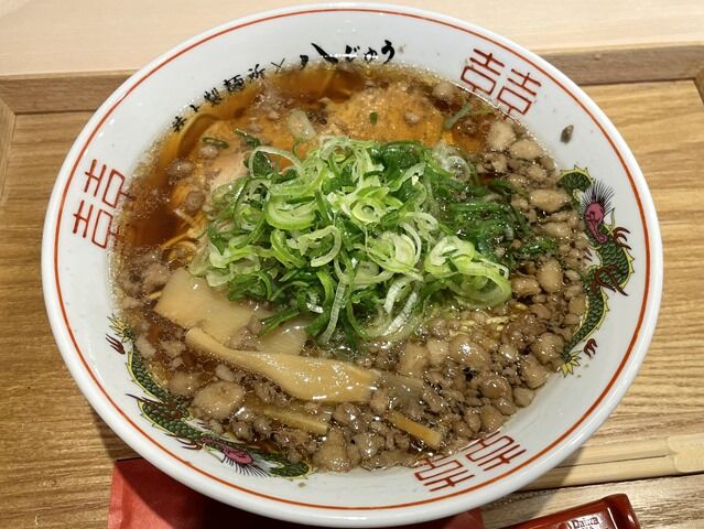 双喜紋と龍があしらわれたパーマネントなラーメン丼が割り箸とレンゲと共に木製トレーに載って着丼。