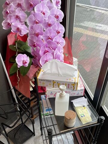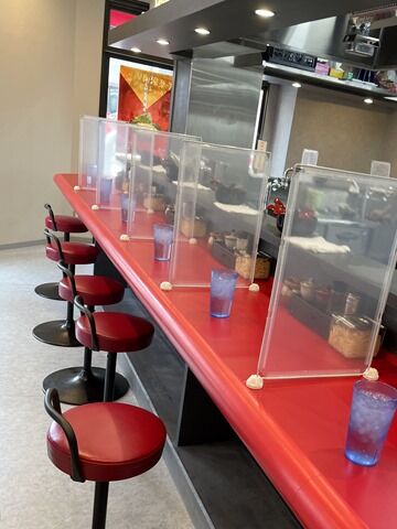 店内は厨房を囲むL字型カウンター12席(7・5)、2人卓x3。カウンター1席ごとにアクリル板の仕切り設置。消毒液は券売機近くに配置。