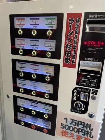 券売機は高額紙幣対応の最新鋭機が2台横並びで配備。主なメニューはラーメン並750円、チャーシューメン並950円、まぶし丼180円、他。