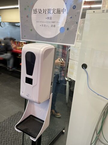 店内は厨房を囲むL字型カウンター11席(7・4)。ですが、3番席は商品受け渡し口になっていて実施てカウンター10席での営業。他に4人卓x1。カウンター1席ごとにアクリル板の仕切り設置。消毒液は入口横に自動噴霧器配置。