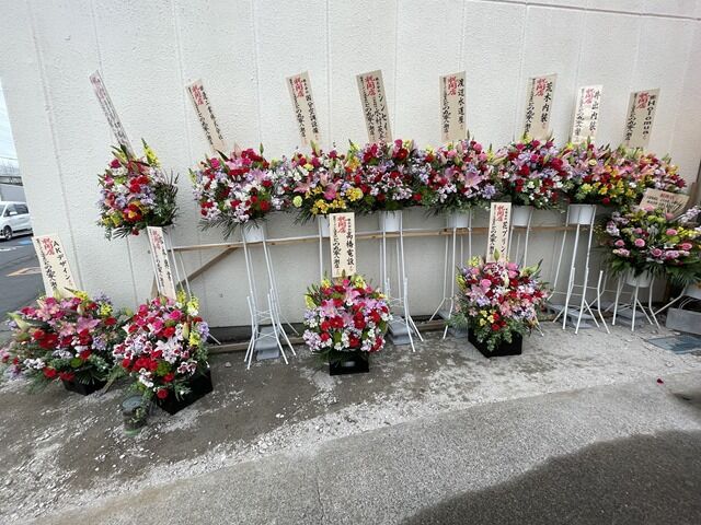 店頭に多数の開店祝花。大きな花輪は王道家清水店主、K-1ファイター小澤海斗氏から。