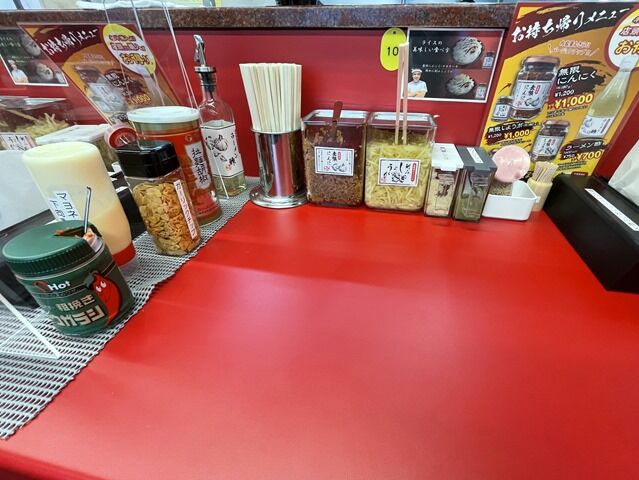 BGMはJ-POP、もう涙はいらない等♪箸は割り箸。卓上調味料・薬味はO Hot粗挽きトウガラシ、マヨネーズ、ガーリックチップ、GS拉麺胡椒、ラーメン酢、無限にんにく、刻みしょうが、無口臭ニンニク、グリーンニンニク、摺り胡麻。